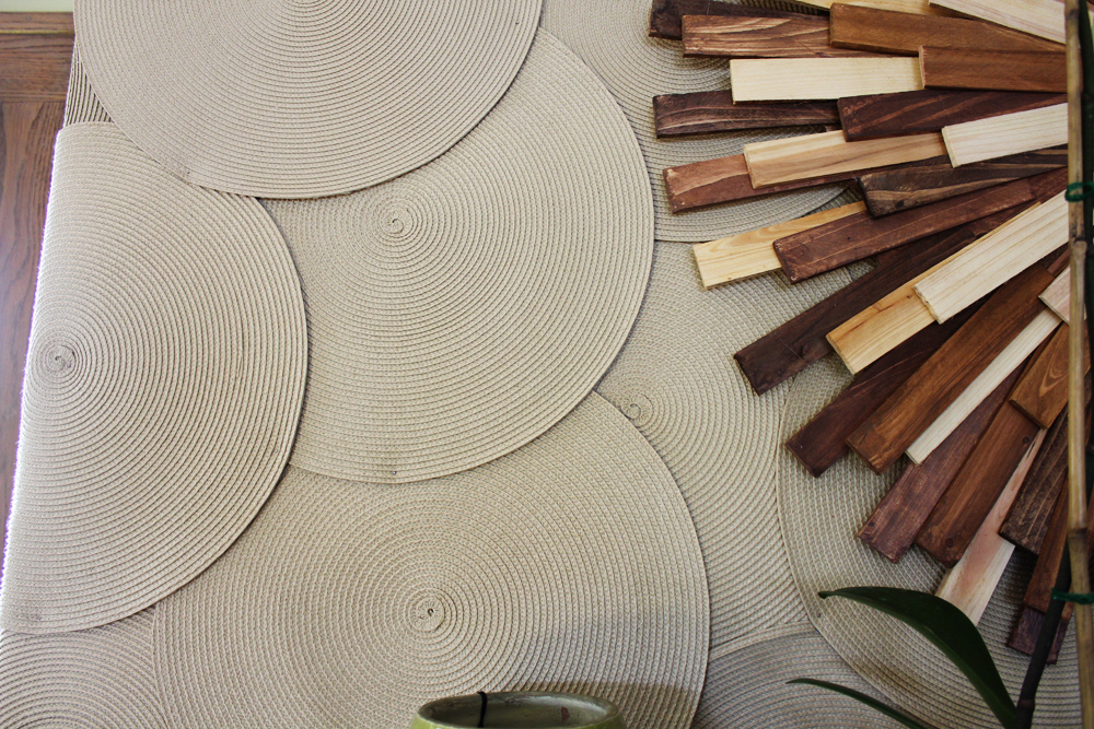 The wall above the fireplace is covered with round placemats and the sunburst mirror is made with wood shims!