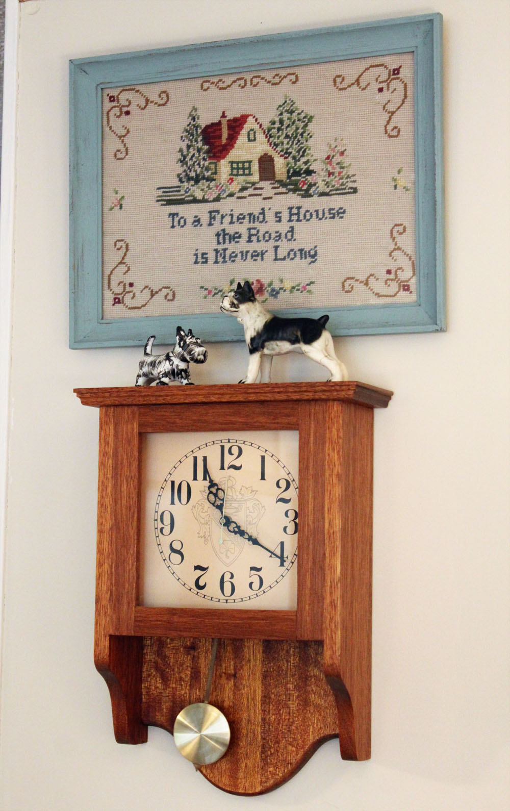 I love the punch of color, and think it adds to the cottage look of the piece. I hung it above a clock my oldest son made many years ago in a shop class...and added a couple of friendly little dogs...